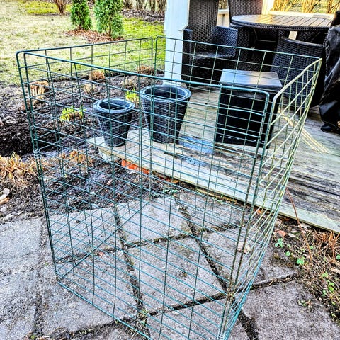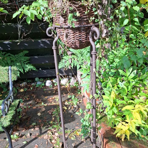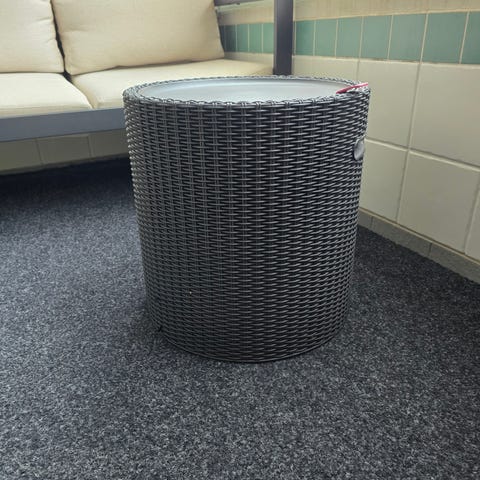 Puuterassi- ja lasikantinen polyrottinkipöytä sekä metalliset kukkalaatikot