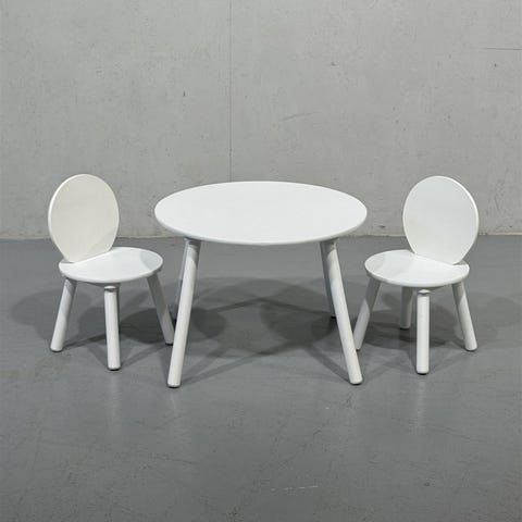Eames-henkiset lasten sininen pyöreä pöytä ja kaksi tuolia. Pöydän korkeus 46 cm ja halkaisija 60 cm.