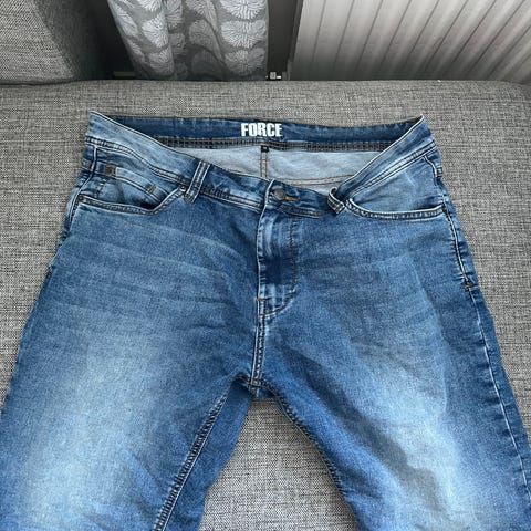 Farkkushortsit, jotka ovat todella vahvaa kangasta. Shortsien vyötärönympärys on 86 cm ja pituus 54 cm. Huomaa, että shortsien koko on lähempänä M-kokoa vyötärönympäryksen perusteella, kuin XL, joka lapussa näkyy.