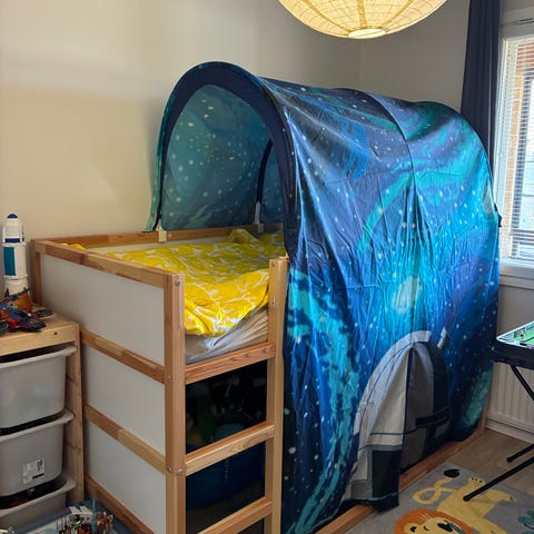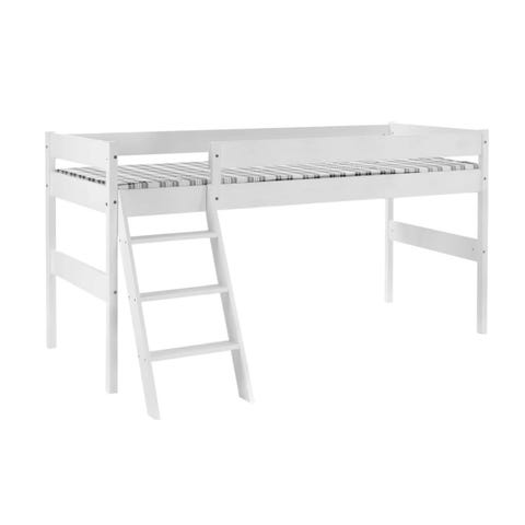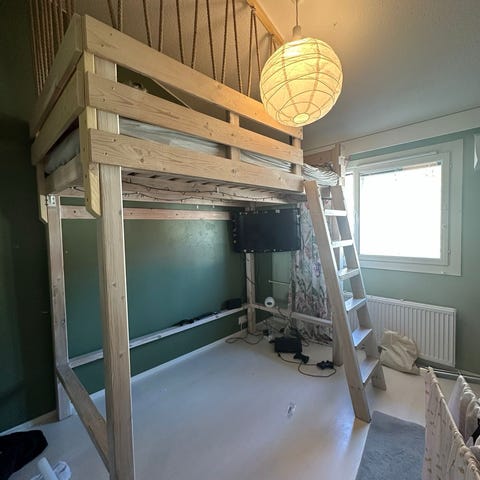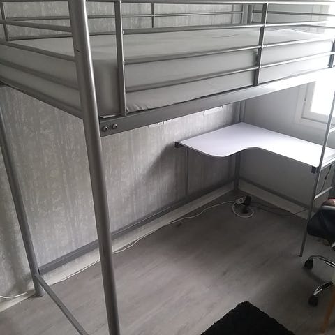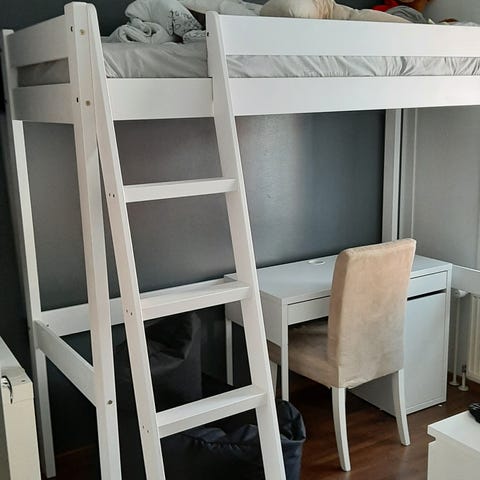Muurame parvisänky valkoinen. Lastensänky on korotettu, ja sen alla on avointa säilytystilaa esimerkiksi leluille tai laatikoille. Sängyssä on sivulaidat, jotka auttavat ehkäisemään putoamista, sekä päädyssä kiinteät kahvat tai portaat helpottamaan sänkyyn kiipeämistä. Sängyssä on käytönjälkiä. Patja ei kuulu kauppaan.