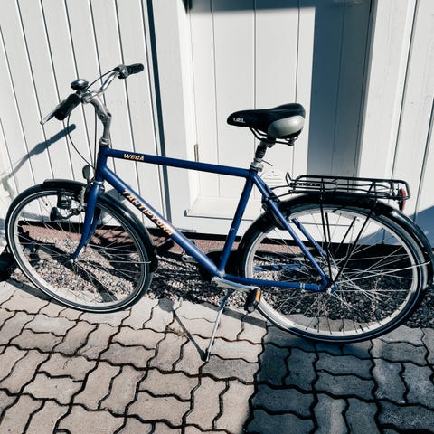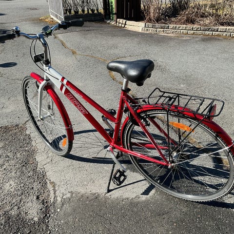 Ylimääräisenä hyväkuntoinen citypyörä. Etulokarissa halkeama muovissa mutta ei vaikuta mitenkään ajoon. Siisti kuntoinen. Toki käytön jälkiä.