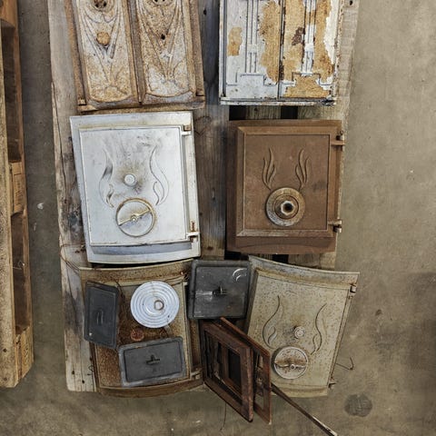 Antiikkisia, vanhoja hellan ja ja takan luukkuja