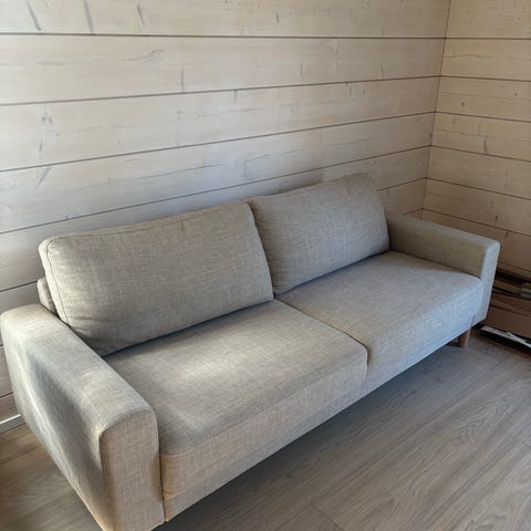 Vaaleanharmaa sohva. Pestävät kaksipuoleiset istuinpäälliset. Metalliset jalat. Valmistaja Asko. Myydään tilanpuutteen vuoksi.