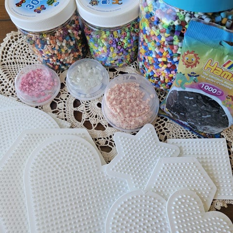 Iso laatikollinen erivärisiä Hama-helmiä sekä 8 alustaa. Nouto Kinkomaalta.