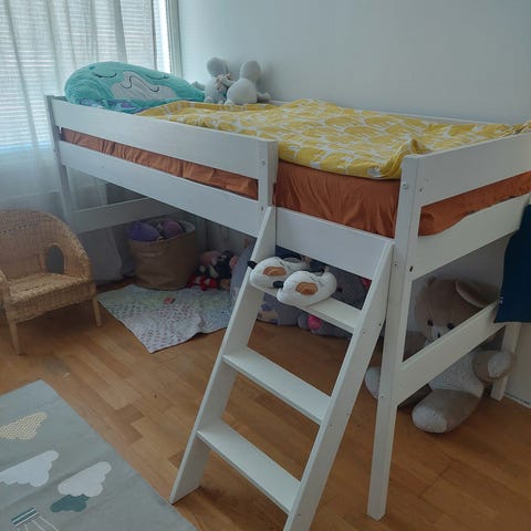 Hyväkuntoinen kuultovalkoinen mäntyinen parvisänky. Sängyn alapuolella työpöytälevy ja hyllykkö. Ostettu uutena ja kasattu vain sen yhden kerran. Tikkaat voi laittaa sängyn oikeaan tai vasempaan reunaan. Mukaan saa halutessaan patjan ja ledivalot. Pöytälevyssä sekä sängyn toisessa päädyssä muutamia tahroja ja kolhuja. Nämä saanee halutessaan korjattua hiomalla ja maalaamalla.