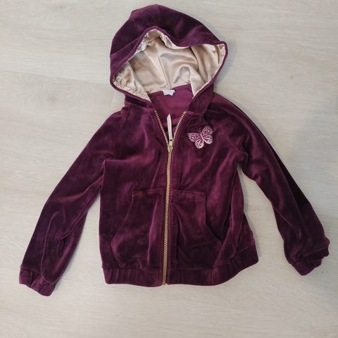 Toisessa hupparissa yksivärinen violetti samettimainen pinta ja vetoketju edessä. Lindexiltä, kokomerkintä 110/116
