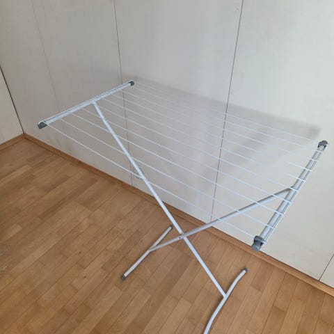 Käyttämätön laatikossa oleva Kolmikerroksinen pyykinkuivausteline, jossa useita vaakasuoria tankoja pyyhkeiden, vaatteiden ja liinavaatteiden kuivaamiseen. Telineessä on sivuilla koukkutelineet henkarivaatteille sekä pyörät helpottamaan siirtämistä. Väri harmaa-valkoinen. Soveltuu sisäkäyttöön esimerkiksi kylpyhuoneeseen, kodinhoitohuoneeseen tai parvekkeelle.