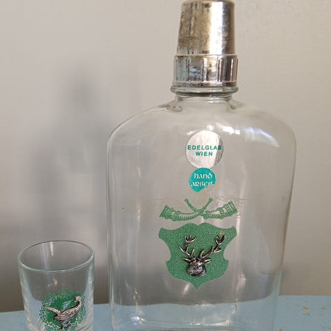 Karlovy Varyn posliininen kylpyläjuomakuppi (tunnetaan tšekiksi nimellä Lázeňský pohárek), jota käytetään mineraaliveden juomiseen suoraan lähteestä. Korkeus 9.5cm. Kannun yläosa 3.5x7cm.