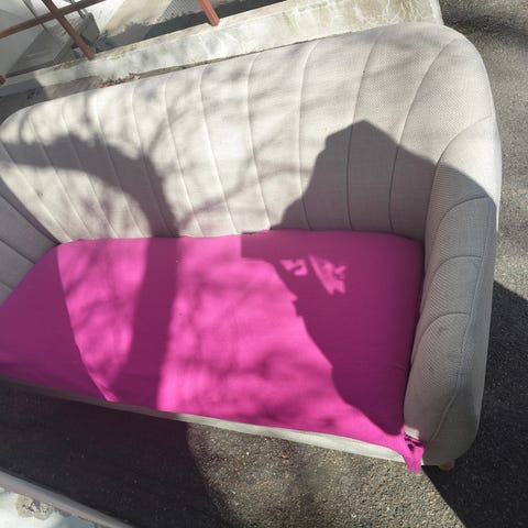Sohva on hyvässä kunnossa ja siisti. Ollut kissataloudessa, mutta on imuroitu huolellisesti. Huomioithan mahdollisen allergiariskin, jos olet herkkä. Miehelläni ei ole muistikuvaa, mistä on ostanut sohvan 3v sitten. Mutta veikkaan, että Masku, Asko tai Jysk.
