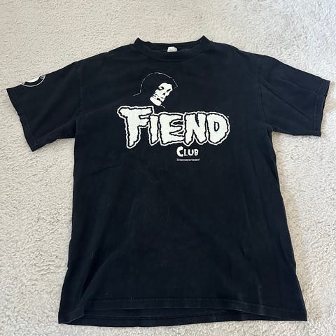 Käytetty, pesussa harmaantunut, printissä tosin vain lievää kulumaa. Kauluksen tikkaukset hieman nukkaantuneen näköiset, ihan jepa paita eniveis. Fruit of the loom, L-koko, 100% puuvillaa.