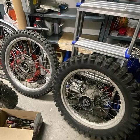 Moottoripyörän renkaat ja vanteet. Kuvassa näkyy kaksi pinnoitettua vannetta renkaineen. Sopivat maasto- tai endurotyyppiseen käyttöön kuvassa näkyvän kuvioinnin perusteella. Tarkemmat mitat, merkki ja malli eivät käy ilmi kuvasta, joten ne on hyvä tarkistaa renkaiden kyljestä tai mitata ennen ostoa. Soveltuvat varaosiksi tai vaihtorenkaiksi moottoripyörään, johon koko ja kiinnitykset vastaavat näitä vanteita ja renkaita.