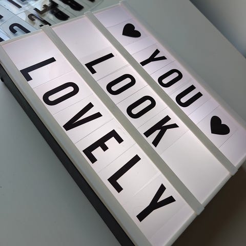 Valotaulu, jossa vaihdettavat kirjaimet ja symbolit. Taulussa on kolme riviä tekstiä varten ja se toimii sisustuselementtinä esimerkiksi olohuoneessa, makuuhuoneessa tai juhlissa. Kirjaimia ja symboleja voidaan järjestellä uudelleen halutun tekstin muodostamiseksi. Taulu asetetaan tasaiselle pinnalle, kuten hyllylle tai pöydälle.