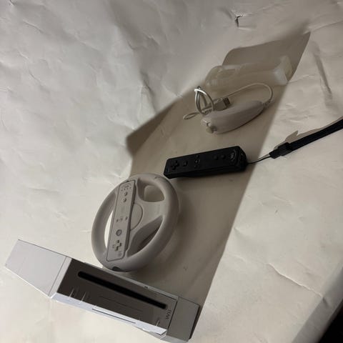 Nintendon Wii konsoli, kaksi ohjainta, nunchuk ohjaimen sekä yhden mikin.