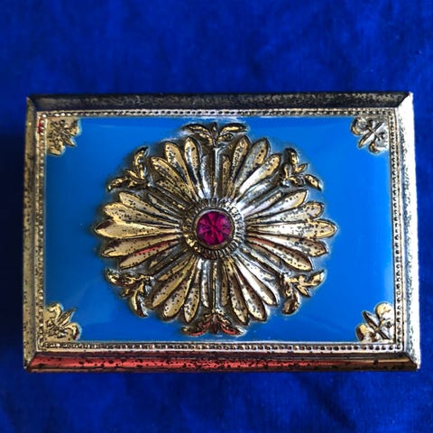 Sydämen muotoinen, sinisellä kankaalla vuorattu metallinen korurasia