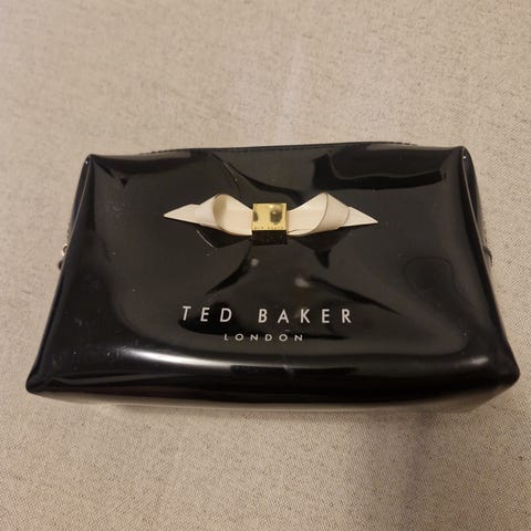 Ted Baker laukku naisille. Materiaalina on muovi. Laukussa on vetoketjusuljenta ja etupuolella koristeellinen rusetti. Sopii esimerkiksi meikkipussiksi tai pieneksi käsilaukuksi arkeen ja juhlaan. Ted Baker -logo edessä.