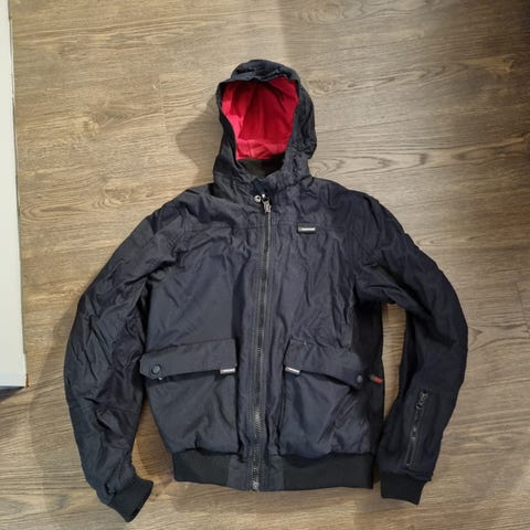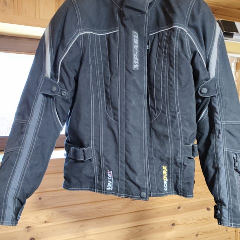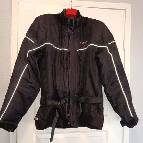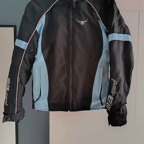 M-Racing ajotakki väri pääosin musta, hartioissa ja yläosassa valkoiset paneelit sekä oranssit raidat hihoissa ja rinnassa. Edessä vetoketjukiinnitys ja korkea kaulus. Takissa on painatuksia edessä ja selässä. Sisäpuoli on punainen, kevyesti topattu vuori (irroitettava). Hihansuissa ja helmassa säätömahdollisuuksia tarranauhoilla ja vetoketjuilla. Soveltuu moottoripyörä- tai mopokäyttöön sekä muuhun ajovarustekäyttöön sääsuojaksi. Merkkilapussa kokomerkintä, joka auttaa oikean koon arvioinnissa.