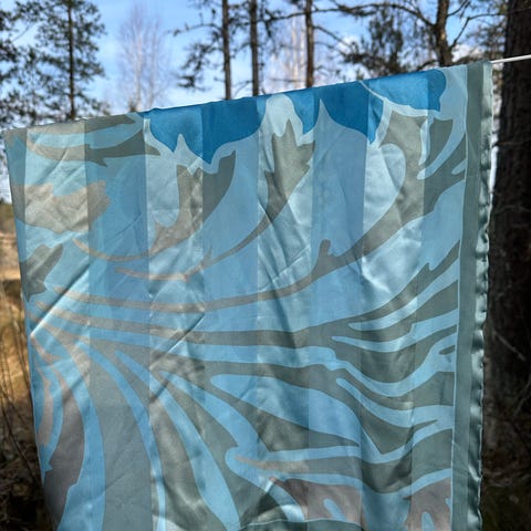 Paisley tyyppinen kuvio, sininen reuna, pienehkö huivi. Vaikuttaa silkiltä. Pääväri ultamariini, viinin/terracotta punainen.