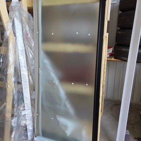 Suihkun lasinen väliseinä. Korkeus 130cm leveys 75cm paksuus 4cm lasin paksuus 4mm. Kääntyvä lasi/180astetta