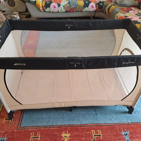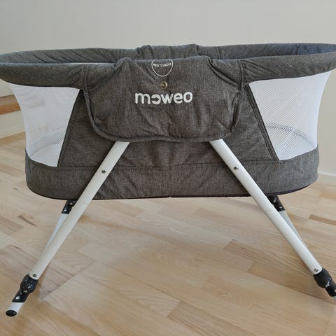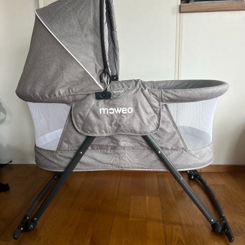 Moweo matkasänky vauvalle. Sängyssä on pehmustetut laidat ja vaalea kangasverhoilu. Runko on metallia ja jaloissa on pyörät helpottamaan siirtelyä. Sängyn mukana tulee patja. Soveltuu vauvan nukkumiseen kotona tai matkalla. Väri vaalea, neutraali sävy.