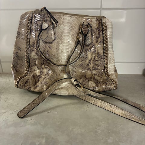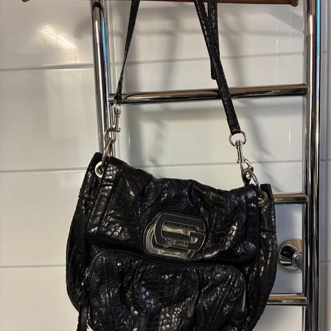Guess olkalaukku / käsilaukku,irrotettavalla olkaimella naisille. Materiaalina tekonahka, jossa käärmekuvioitu pinta ja metallisävyinen harmaa väritys. Laukussa on säädettävä olkahihna sekä kantokahva. Edessä vetoketjutasku ja koristeena Guess-logo sekä avainkoriste. Sopii arkilaukuksi ja mukaan mahtuu päivittäisiä tavaroita, kuten lompakko, puhelin ja pienet henkilökohtaiset tavarat.