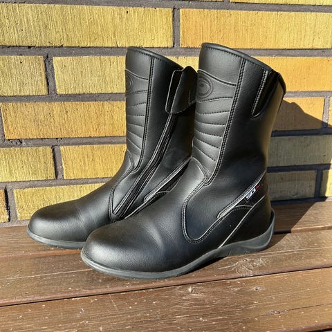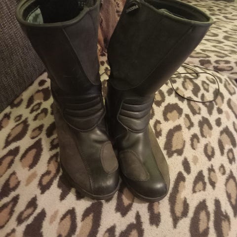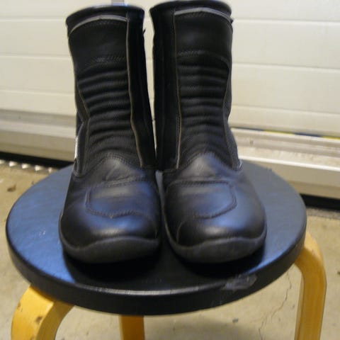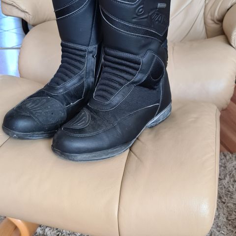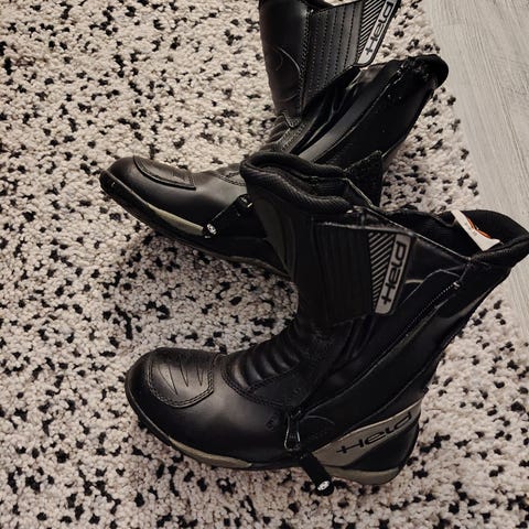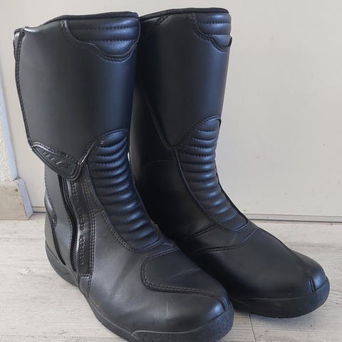 Kunnolliset moottoripyöräkengät, tukevat, tarrat kunnossa ja kengän numero 39