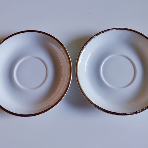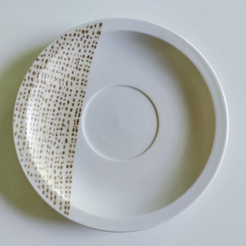 Pieni kahvikupin aluslautanen piippuleimalla. Halkaisija n. 10,6 cm ja korkeus n. 1,3 cm. Reunassa yhdessä kohdassa jotain ”röpöä” (kuva 2).