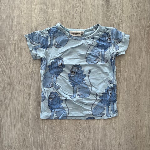 Mini Rodini vihreä leijona t-paita 92/98. Tahra edessä, alhaalta sauman vierestä korjattu reikä ja vähän venähtäneitä kohtia kankaassa. Käytetty kunto.