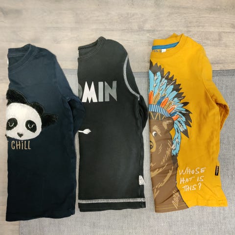 Pakettiin kaupan päälle myös toinen samanlainen autot paita, värit kuluneet, ja Lindex koira t-paita käännettävillä paljeteilla.