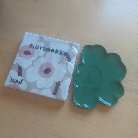Marimekko lautanen, jossa kasviaiheinen kuviointi. Lautasen pohjaväri on vaalea ja kuvio vihreä. Soveltuu arki- ja kattamiskäyttöön esimerkiksi ruoka- tai tarjoilulautasena. Lautasen pohjassa Marimekon merkinnät.