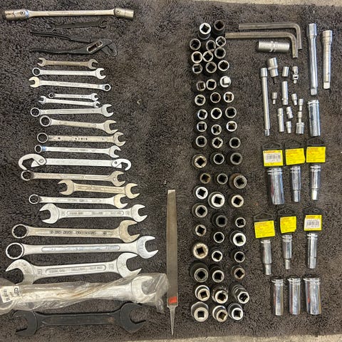 Ruuvimeisseleitä, kiintoavaimia, räikkäväännin, pari hylsyä, poranteriä, kärkipihdit, linjapihdit, sivuleikkurit, mattopuukko, viila, rautasaha, silikonipuristin, pensseli, lasta, taltta, kuusiokoloavainsarja, siirtoleukapihdit, rullamitat, nippusiteitä.