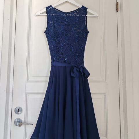 Juhla/rippimekko, koko 34. Mekko on sininen ja polvipituinen. Yläosa on joustava ja istuu hyvin käyttäjän mukaan. Vetoketju kiinnitys takana. Vyötäröllä on nauhavyö, joka solmitaan eteen. Alaosa on kevyesti laskeutuva.