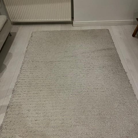 Myydään iso vaalea räsymatto. Lähikuvassa näkyy väri tarkemmin. Pesty käytön jälkeen pesukoneessa.
