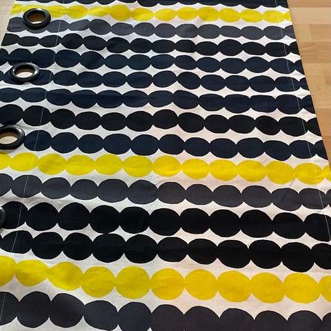 Ompelijalla (Aliina Kerava) teetetyt Marimekon paneeliverhot. Koko noin 65x255cm/paneeli. Noin vuoden vanhat, eivät uusille häpeä.