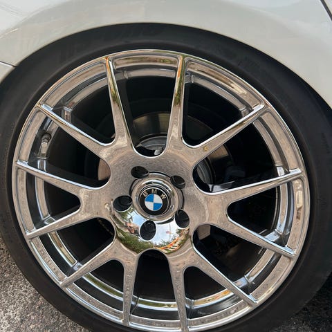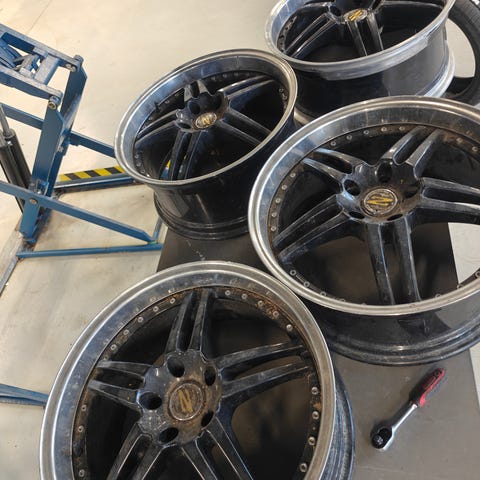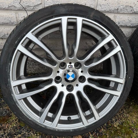 BMW-style, ei taida orkkikset olla. Lähes uudet kesäkumit päällä. Vasen etuvanne haljennut, josta kuva. Pulttijako 5x120