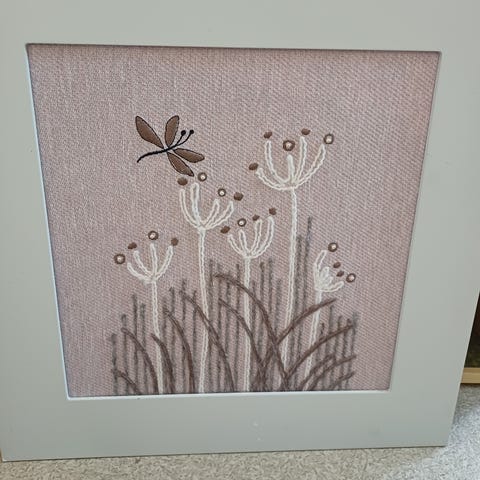 Käsintehty kukkakirjailtu taulu kultakehyksillä