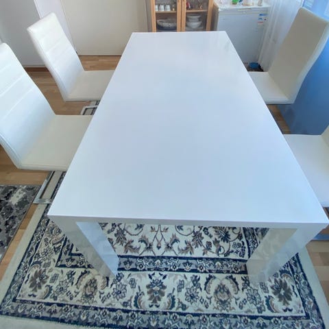 Upeat tuolit ja pitkä pöytä pöytään jatkolevyllä. Kotimaista työtä ja tukeva mekanismi alla. Todella siisti ja koko ryhmä 1400€. Myyn suuruuden takia. Tuolit valkoista nahkaa, ei kellastumisia. Ollut hyvin vähäisessä käytössä. Lähes, kuin uusi. Tarvittaessa pöytäliinoja Stockmannin mallistosta.