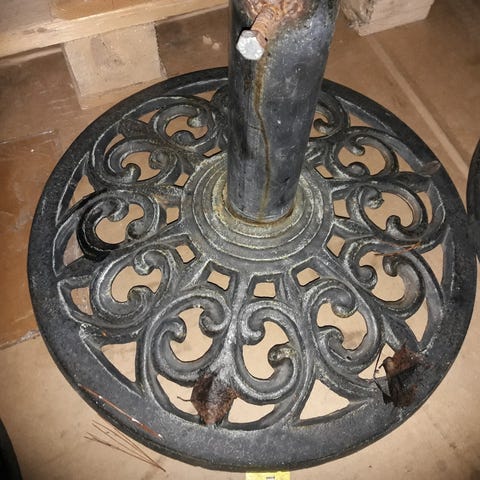 Käsityönä tehty painava ja tukeva rautainen jalka, sopii puutarhaan kevyelle tukipylväälle tai ulkojoulukuuselle, löytyy 2 kpl.