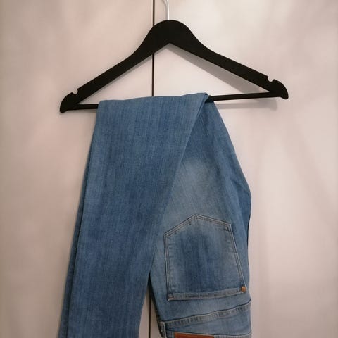 Benetton Skinny naisten/miesten matalavyötäröiset farkut. Malli on kapealahkeinen (skinny). Väri valkoinen ja materiaali denim. Koko on merkitty W31 ja naisten kokoluokitus L. Farkuissa on vetoketju- ja nappikiinnitys edessä, etu- ja takataskut sekä vyölenkit vyötä varten. Lahkeen sivunpituus 102cm. Soveltuvat arkikäyttöön ja yhdisteltäväksi erilaisten yläosien kanssa. Kangasta kulutettu oikean lahkeen etupuolella tyylikeinona.
