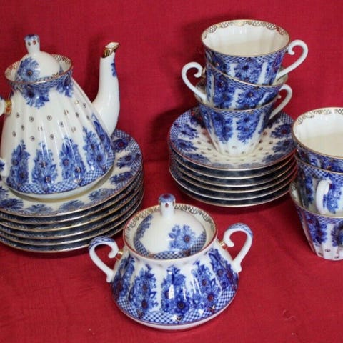 Peritty Itä-Saksassa valmistettu Sevres tyylinen astiasto. Yhdessä asetissa on pieni vika. Korvaavan lautasen voi löytää melko helposti kirpputorilta tai Kierrätyskeskuksesta.
