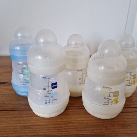 MAM tuttipullot kaikki kuvassa näkyvät. Ollut käytössä yhdellä lapsella, aluksi pesty käsin, mutta loppuvaiheessa pesty tiskikoneessa. Tutit on kokoa 2, eli ei ole ollut alusta asti käytössä, voin heittää roskiin jos niitä ei haluta. Isointa pulloa käytetty vähiten kun ei niin isolle määrälle ollut tarvetta.