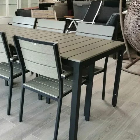 Tässä ryhmässä Suvi Cafe -ruokapöytä on yhdistetty Suvi -malliston Aintwood - käsinojattomien tuolien kanssa. Säänkestävät kalusteet ovat hoitovapaita ja niiden laatu on ensiluokkaista ja kestävää. Suvi Aintwood -käsinojattomat tuolit ovat pinottavia, mikä helpottaa talvisäilytystä, kun tuolit saa varastoitua pienempään tilaan.