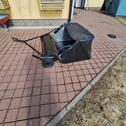 Perässä vedettävä lehtikeräin ajoleikkuriin. Uutena ostettu 199e.