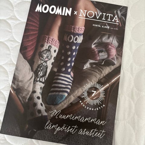 Moomin x Novita neuleohjelehti Muumilaakson suosikkineuleet. Lehdessä on erilaisia neuleohjeita 7kpl, joissa on muumiaiheisia kuvioita ja yksityiskohtia. Ohjeet on suunniteltu käytettäväksi Novitan lankojen kanssa ja ne sopivat erilaisten neuleprojektien, kuten paitojen ja asusteiden, tekemiseen.