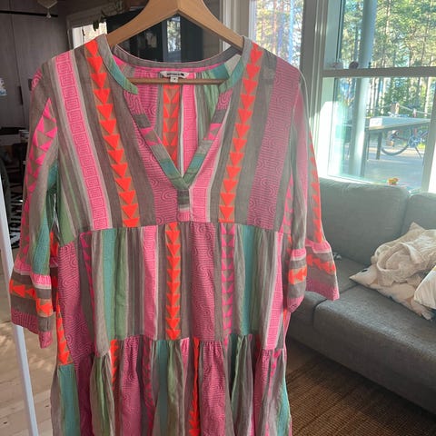 Indiska vihreä kesämekko naisille. Koko S eli 36. Materiaali viskoosia. Lyhythihainen malli, jossa on V-pääntie ja useampi poikkisauma helmaosassa. Soveltuu arki- ja vapaa-ajan käyttöön.