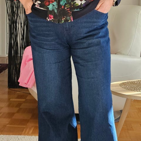 Vähäisessä käytössä. Hyvässä kunnossa. Minusta reilu 2XL koko. Kuten kuvassa näkyy lahkeessa edessä halkio.