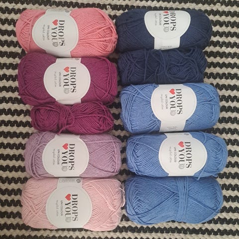 Drops Karisma lankakeriä tarpeettomana yhteensä 13 kerää, joista yksi on purkautunut ja siksi näyttää vyötteen kanssa erilaiselta. Kahdesta kerästä aloitettu neulonta, mutta purettu.