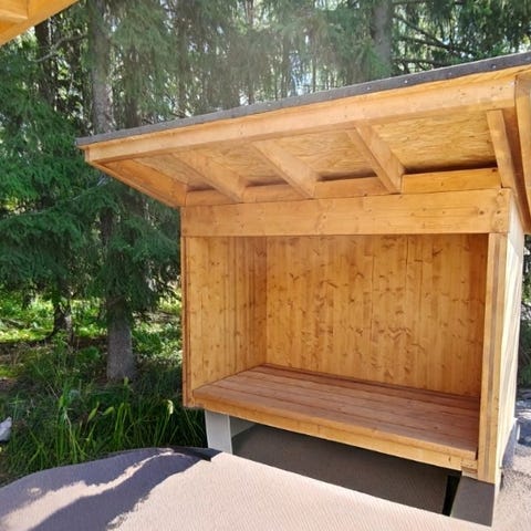 Painekyllästerystä tehty rakoliiteri / katos, jonka pohja-ala n. 140x225cm. Korkeutta n. 2,5m korkeimmasta kohtaa. Sisällä 185cm pitkä ihminen pystyy seisomaan kauttaaltaan lyömättä päätä katon rakenteisiin. Tilavuus reilu 5.5m3. Tehty sinkityn 45x45mm putkirungon päälle, joten ei notku ja kevyt laattaperustus riittää. Katteena musta pural pinnoitettu kattopelti. Monia käyttökohteita: halkokatos, varasto tai vaikka huvimaja / pergola. Kuljetus 50km sisälle sisältyy hintaan. Kuvan pyöräsarja ei kuulu hintaan. Huom. kuvissa katos ei ole asennettu vaakasuoraan.