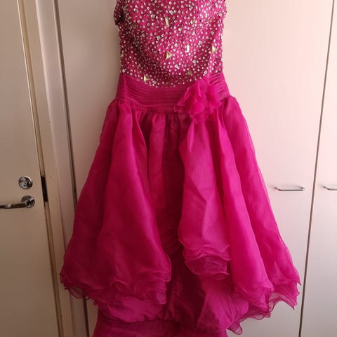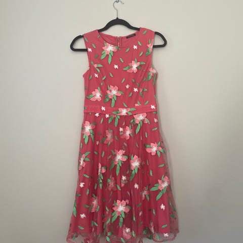 Korallinpunainen mekko merkiltä Delicate. Koko 36, joustaa hieman. Hyvin vähällä käytöllä ollut. Päälliskankaan alla aluskangas. 97 % polyesteriä, 3 % elastaania. Pituus 97 cm. Eläintalous ja hajusteettomat pesuaineet käytössä.