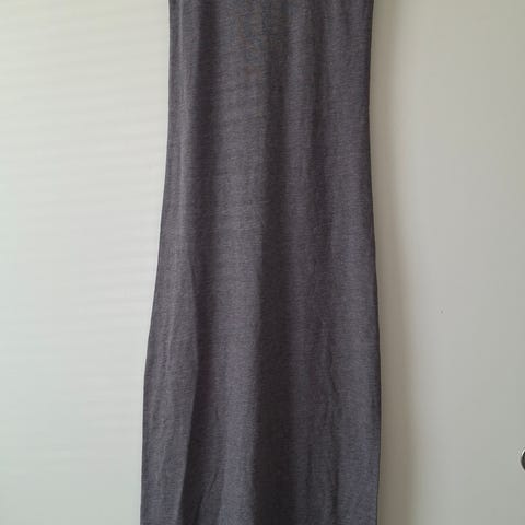 Harmaa sävytteinen trikookangasta oleva kesämekko. Selästä hieman etupuolta avonaisempi.