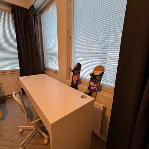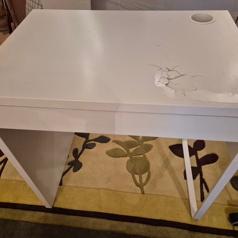 Annetaan Ikean MICKE lasten työpöytä, valkoinen, koko 105x50x75. Työtason pinta on vaurioitunut, (ks. valokuvia) muuten hyvässä kunnossa. Hakekaa pois, annetaan nopeille.